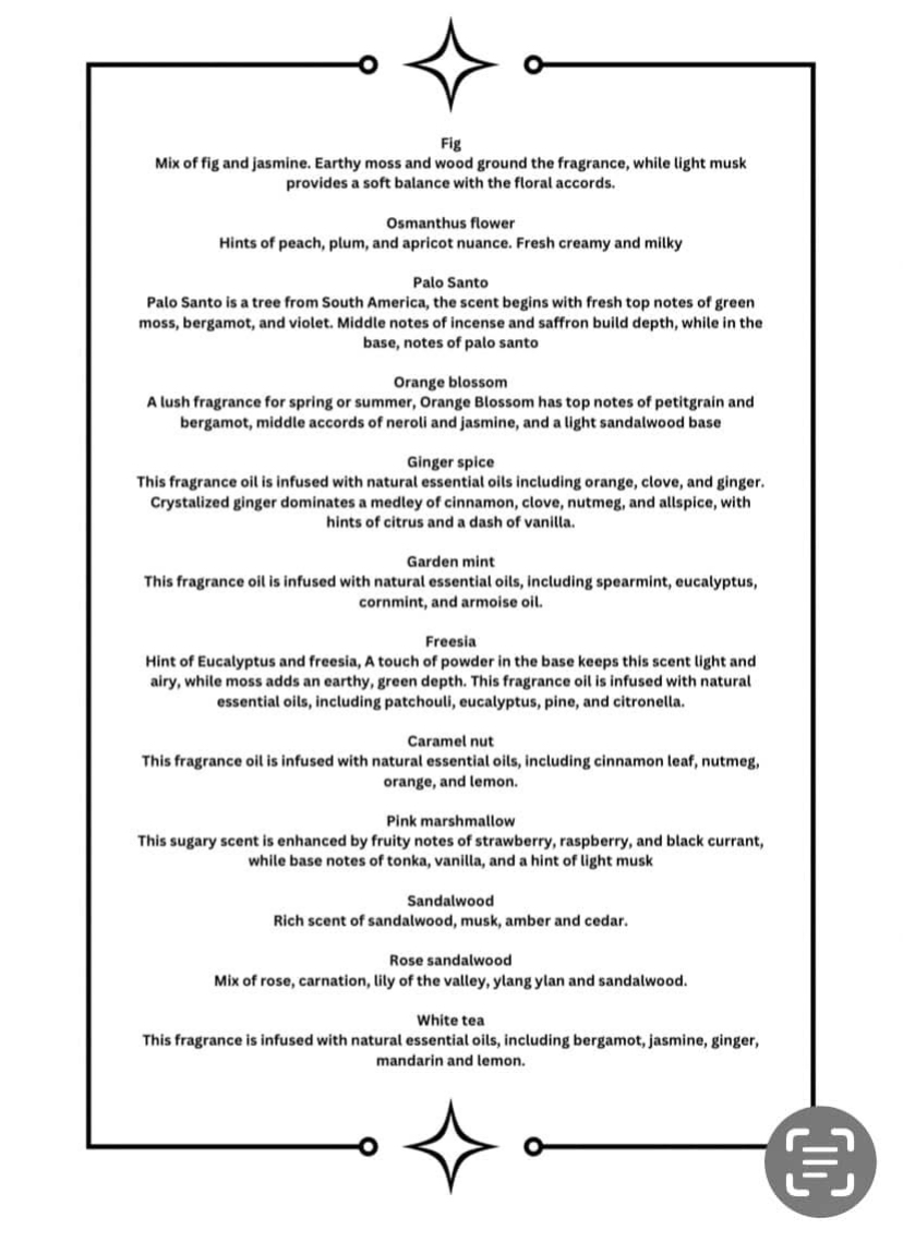 Each candle is hand-poured from 100% natural soy wax, ensuring a clean, long-lasting, and eco-friendly burn. I use safe, high-quality fragrance oils to create exquisite and non-toxic scents.